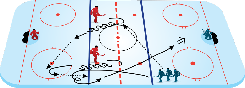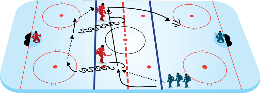 3 Forwards line up along the boards at the blueline, opposite 2 Defensemen . One at a time, each player passes to the Defensemen and skates a specific pattern to support the puck and provide an outlet: