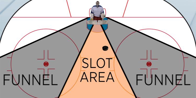 Before games, teams usually warm up by taking shots from directly in front of the net, referred to as the ‘slot’. However, this does not simulate real game action as most shots come from an area known as the ‘funnel’.